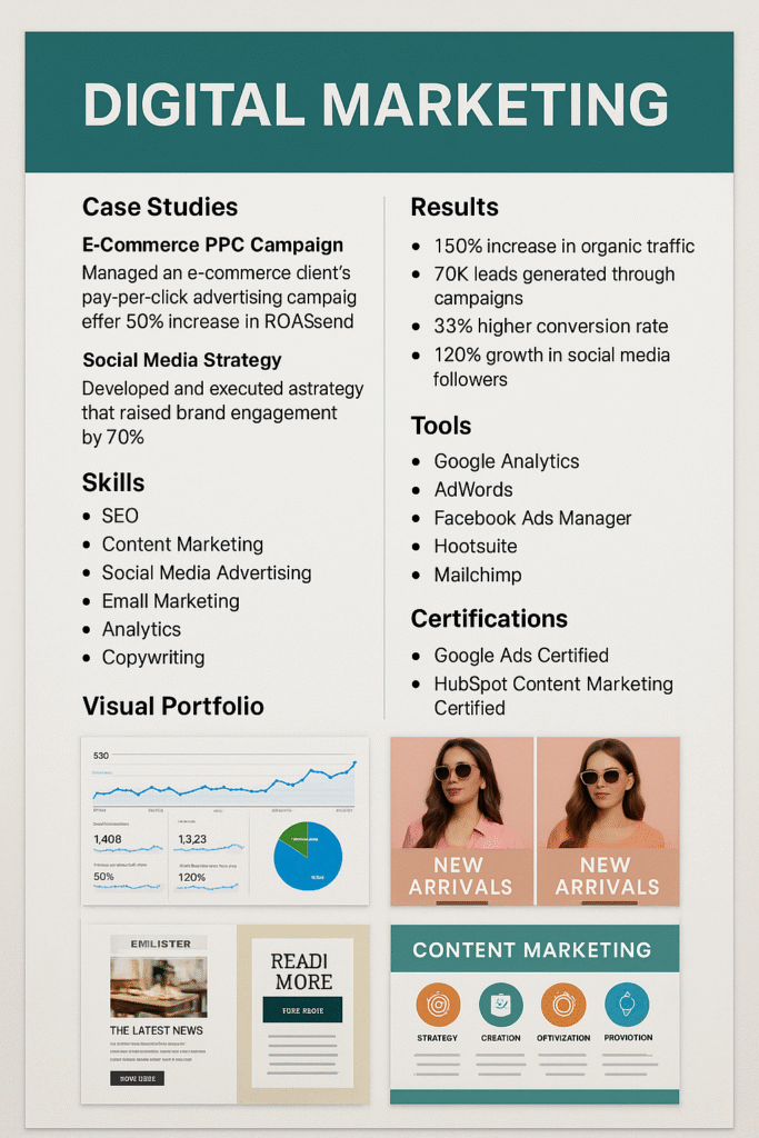 This digital marketing portfolio brings together a strategic blend of data‑driven insights, creative storytelling, and measurable results to demonstrate a full spectrum of expertise. Beginning with an in‑depth SEO Analytics Dashboard, it highlights a 150% surge in organic traffic across six months, showcasing how targeted keyword research, technical optimizations, and engaging content collaborate to boost visibility and conversions. Next, the Social Media Ad Carousel puts a spotlight on dynamic, multi‑image campaigns that achieved a 6× return on ad spend through audience segmentation and rigorous A/B testing of headlines and visuals.